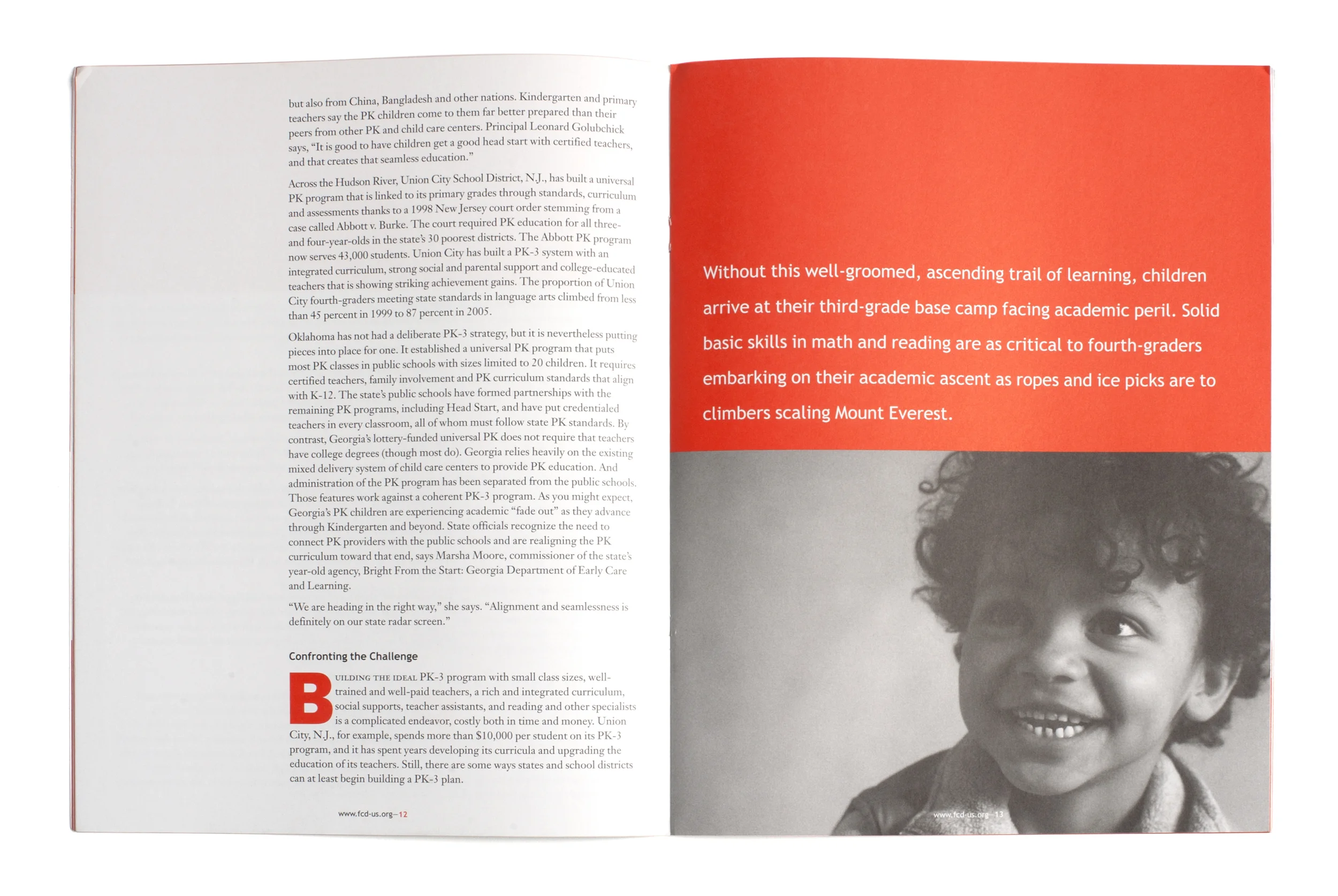 Foundation For Child Development Annual Reports > Offset printing on uncoated text and cover. Critical Insight: “Ultimately it’s about the children.” FCD is a private foundation that funds research and funnels the results to policymaker and educators. The essays, case studies and policy to action briefs can be heavy on content and laborious to read, so by breaking up the copy with engaging images of pre-K 3rd children it keeps the reader visually engaged and makes for a much more compelling story.